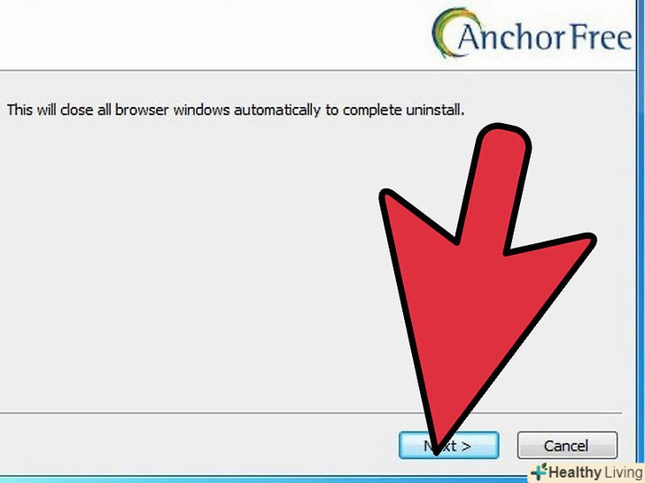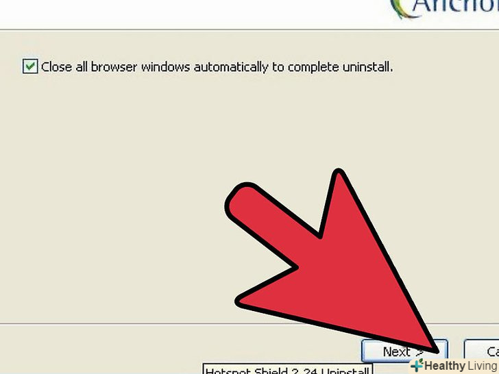 Після закриття і збереження потрібних додатків, Натисніть Next під час роботи програми Hotspot Shield 2.24 Uninstall, щоб перейти до автоматичного видалення програми.