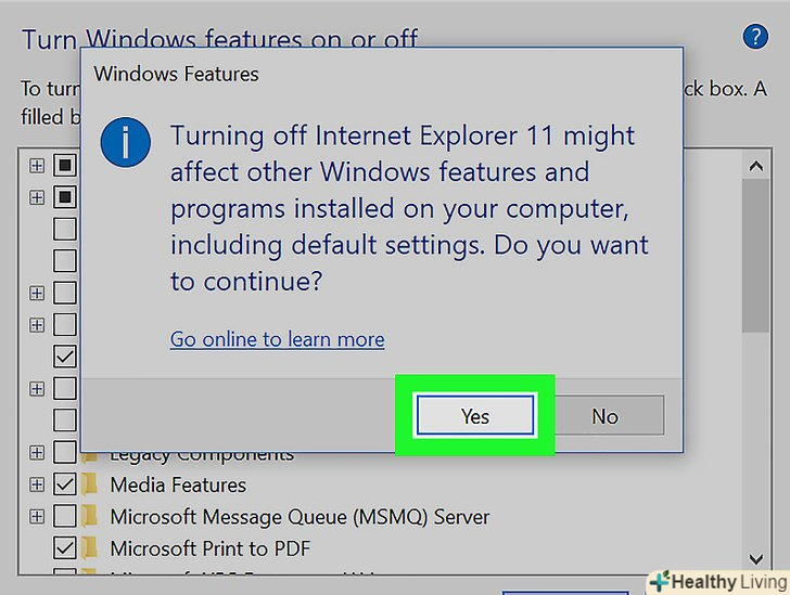 НатиснітьТак, коли з'явиться запит.так ви підтвердите, що хочете відключити Internet Explorer.