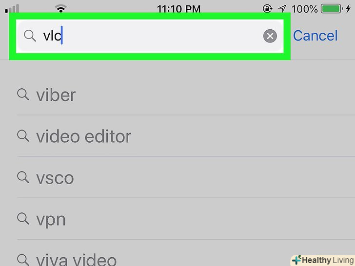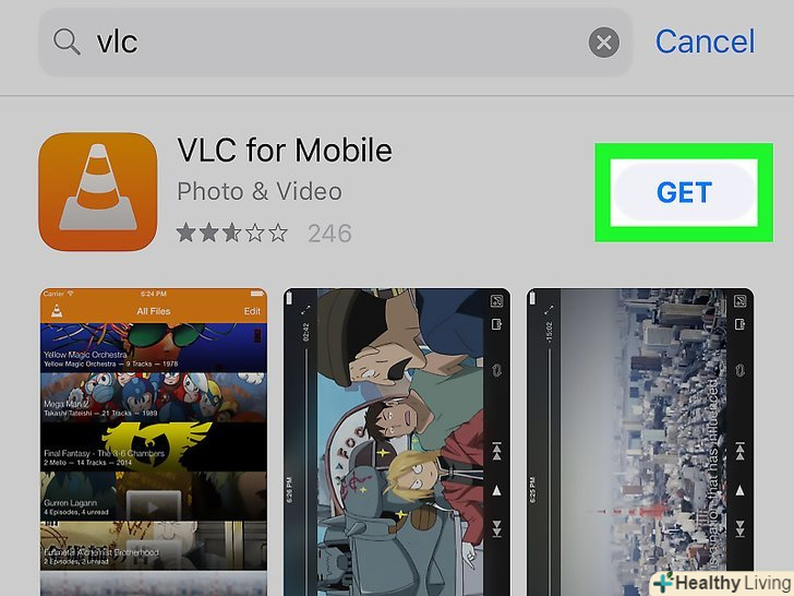 Знайдіть додаток "VLC for mobile".для цього прокрутіть сторінку з результатами пошуку вниз. Значок зазначеного додатка виглядає як оранжево-білий конус.