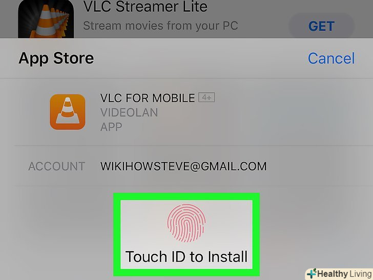Торкніться датчика Touch ID або введіть пароль Apple ID, коли з'явиться запит.запуститься процес установки VLC на iPhone.- Коли процес завершиться, запустіть VLC, натиснувши "відкрити" в App Store.
