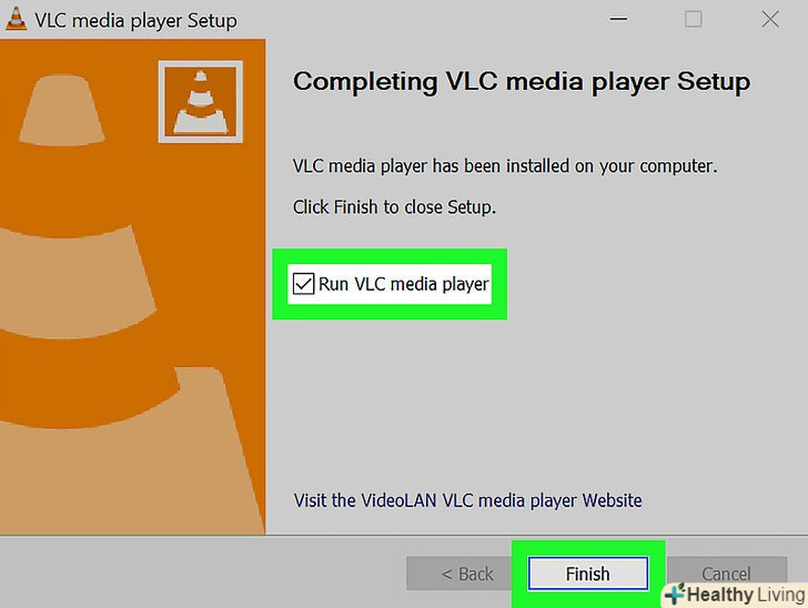 Запустіть VLC.у вікні установника поставте прапорець біля "запустити VLC«, а потім натисніть»Завершити".- Щоб запускати VLC надалі, двічі клацніть по його значку на робочому столі або в меню «Пуск».