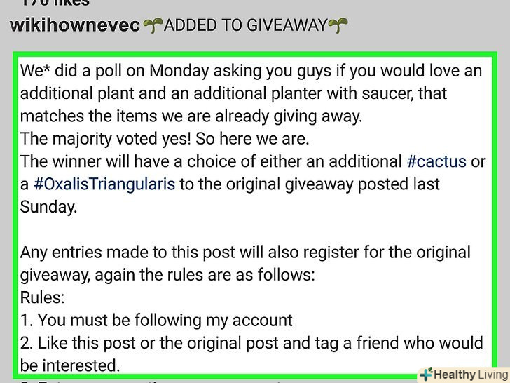 Влаштовуйте промо-акції.спробуйте влаштувати розіграш, щоб залучити нових людей. Щоб промо-акція вийшла успішною, для участі просите людей підписатися на ваш профіль або відзначити друзів в коментарях. Дотримуйтесь правил Instagram щодо розіграшів.