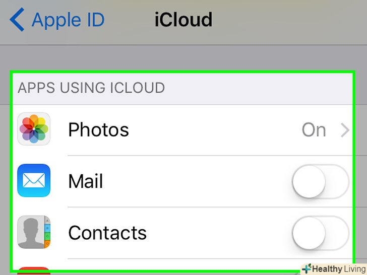 Виберіть дані iCloud для резервного копіювання.пересуньте повзунки у потрібних додатків, наприклад у "замітки «і» календарі«, в положення» включити" (зелений колір), щоб додати дані цих додатків в резервну копію.- Дані додатків, повзунки яких будуть білими, в резервну копію не потраплять.