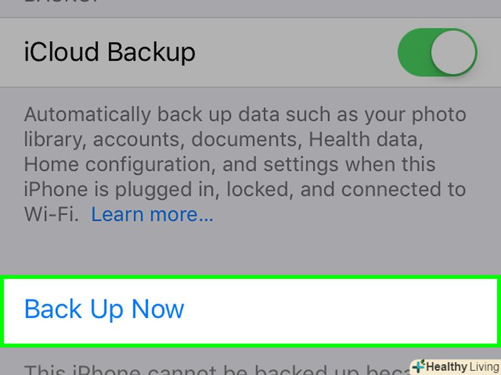 Пересуньте повзунок у "копія iCloud «в положення»включити". Він стане зеленим. Відтепер резервні копії iPhone будуть зберігатися у вашому обліковому записі iCloud (для цього смартфон повинен бути підключений до бездротової мережі).- Щоб створити резервну копію негайно, натисніть "Створити копію зараз" в нижній частині меню.