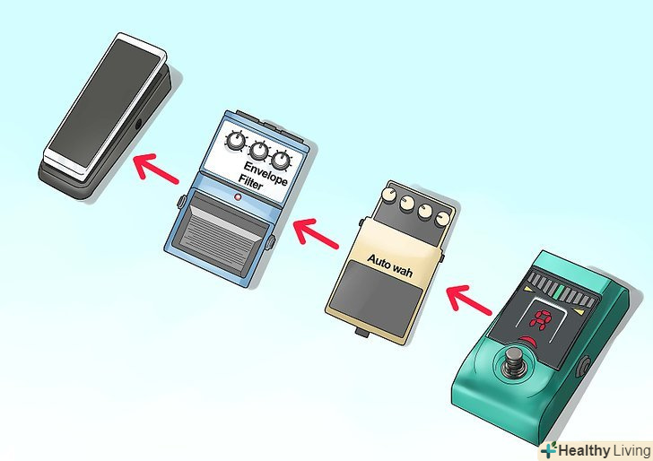 Потім можна підключити фільтри. такі ефекти, як " вау-вау "(wah-wah, autowah), фільтри огинаючої (envelope) і т.д повинні включатися відразу після тюнера. Оскільки ці ефекти розраховані на зміну чистого звуку, установка їх після інших ефектів обмежить можливості їх використання. Якщо ви не використовуєте тюнер, ці ефекти підключаються після гітари.