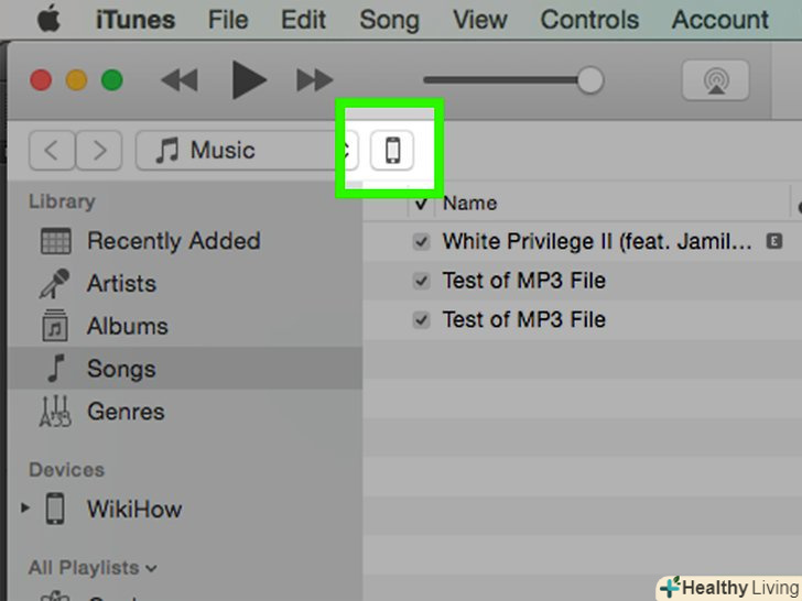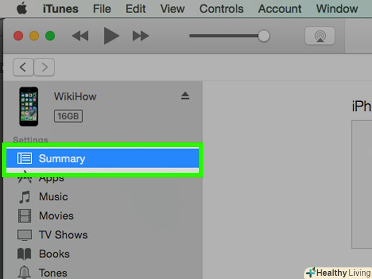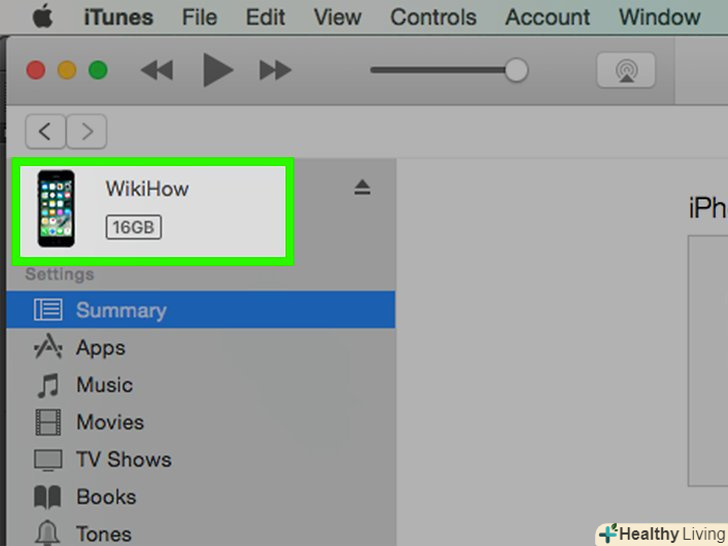 Натисніть на значок iPhone.він відобразиться на сірій смузі у верхньому лівому куті вікна iTunes.