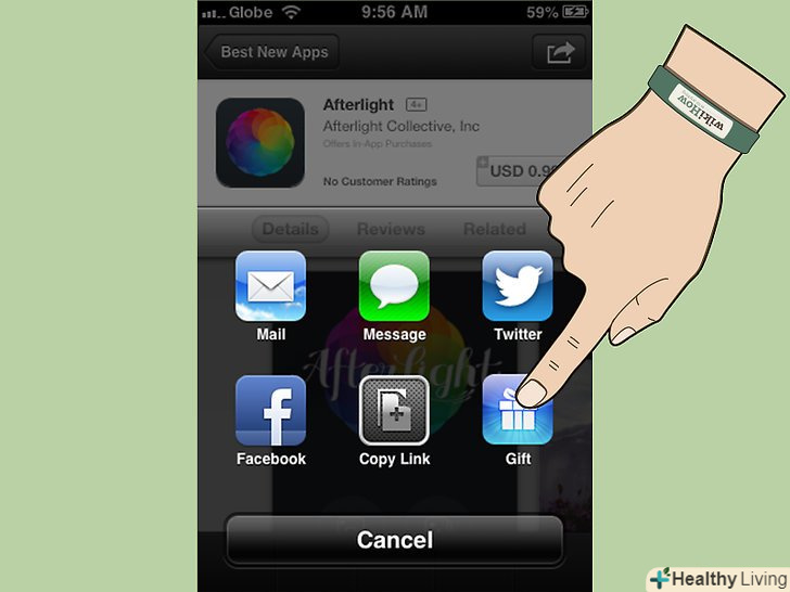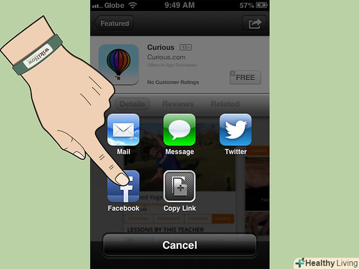 Поділіться додатком за допомогою Facebook.Facebook "Facebook" і ваш додаток буде відправлено через ваш аккаунт Facebook.- Для того щоб ця функція працювала, додаток «Facebook» має бути встановлено на вашому смартфоні. Якщо ні, то ознайомтеся зі статтею про те, як налаштувати додаток «Facebook» на пристрої IOS.