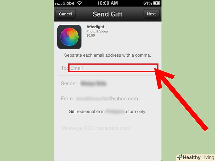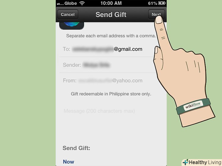 Заповніть дані для подарунка.якщо ви увійшли в свій аккаунт на iTunes, то тепер ви повинні ввести трохи інформації. Потрібно буде ввести адресу електронної пошти одержувача. Також ви можете написати супровідне повідомлення, яке буде відправлено з подарунком.- Увага: адреса електронної пошти одержувача повинна бути такою ж, як і адреса авторизації його аккаунта на iTunes. Таким чином, ви повинні дізнатися точну адресу електронної пошти, перш ніж почати цей процес.