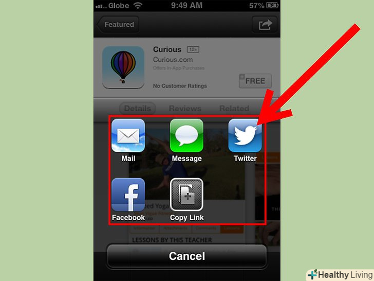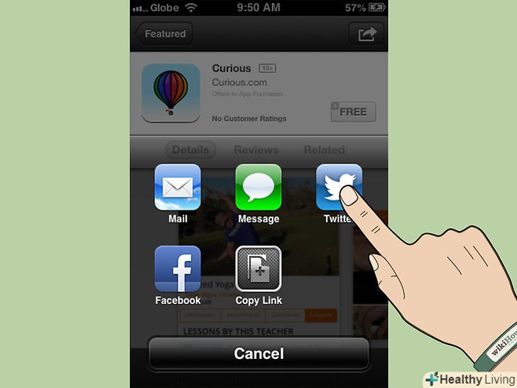 Поділіться додатком за допомогою Twitter. виберіть "Twitter" і ваш додаток буде відправлено через ваш аккаунт на Twitter.- Для того щоб ця функція працювала, додаток «Twitter» має бути встановлено на вашому смартфоні. Якщо ні, то ознайомтеся зі статтею про те, як налаштувати додаток «Twitter» на пристрої IOS.