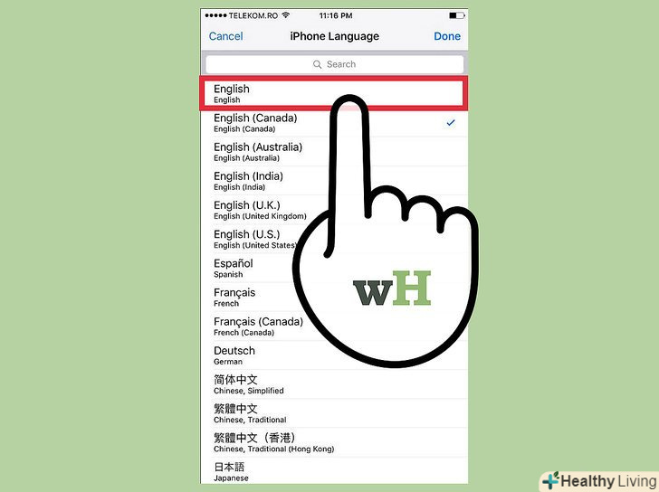 Виберіть потрібну мову.після того, як ви натиснете на» А", з'явиться список доступних мов. Вони будуть написані на своїй рідній мові, щоб вам було легше знайти потрібний. Наприклад, щоб вибрати іспанську, потрібно натиснути на "Español«, Французький – »Français". Натисніть на бажану мову і ваш телефон перейде на нього. Потерпіть, процес переходу на іншу мову займе близько 30 секунд.[3]
