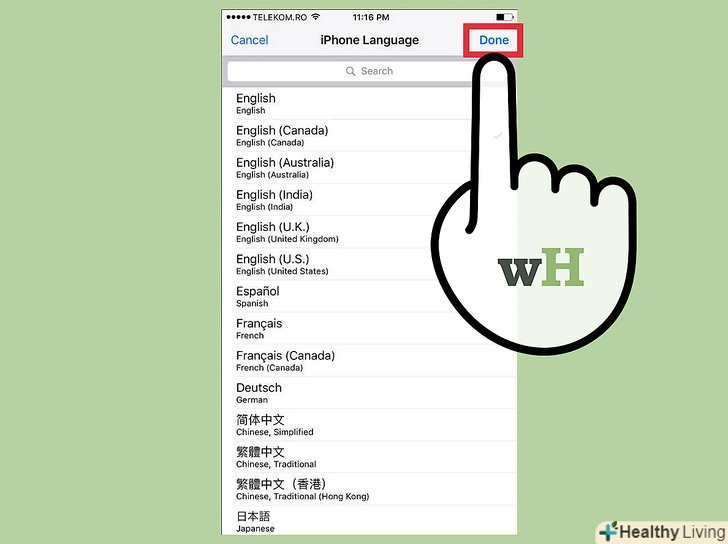 Виберіть потрібну мову та натисніть "Готово".після цього в нижній частині екрана з'явиться запит про підтвердження, в якому буде написано: "Ви правда хочете поміняти мову на___?».- Підтвердіть зміну, натиснувши на кнопку " поміняти на___". Протягом 20 секунд ваш iPhone поміняє мову на той, що ви вибрали.