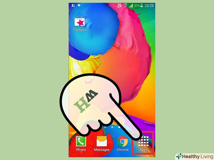 Натисніть на іконку "App Drawer". вона розташована поруч з іншими іконками в нижній частині екрана. У телефоні від Samsung вона знаходиться в дальньому правому куті. Вона має вигляд ряду точок, розташованих у вигляді сітки.