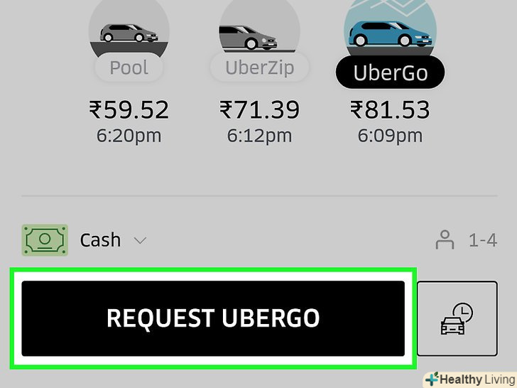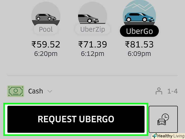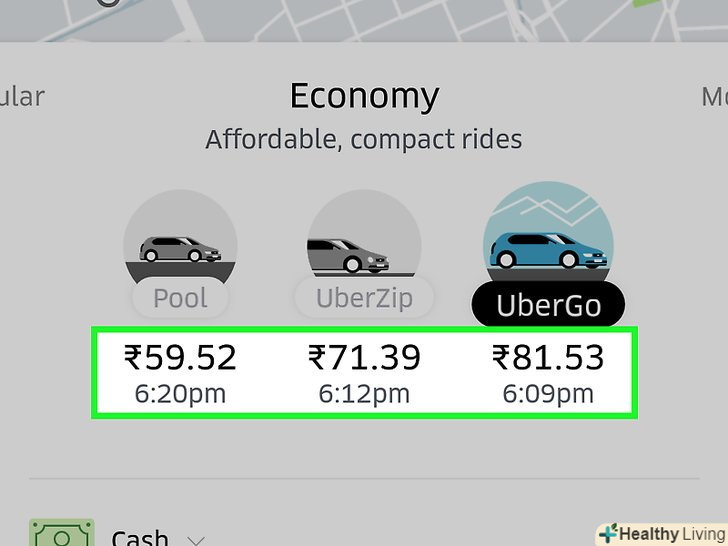 Виберіть тип автомобіля.у нижній частині екрана ви побачите різні типи автомобілів і приблизну вартість поїздки. Виберіть відповідний варіант, і ви побачите приблизний час прибуття автомобіля.