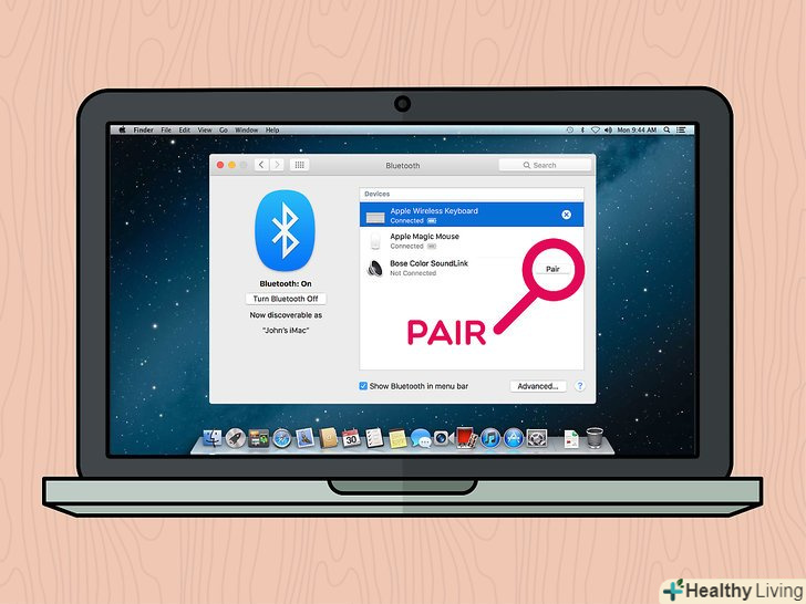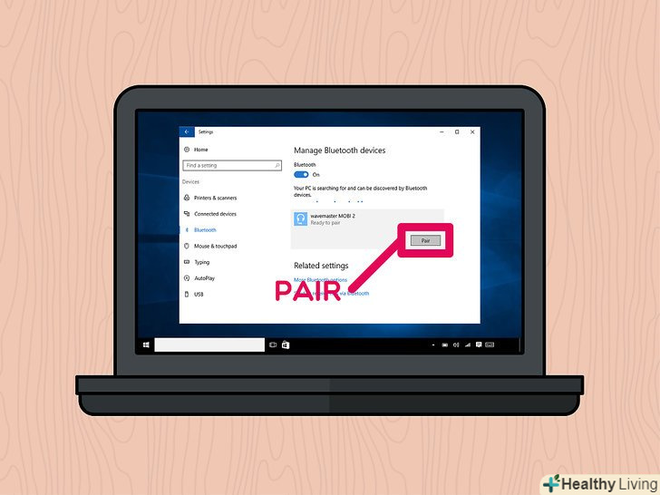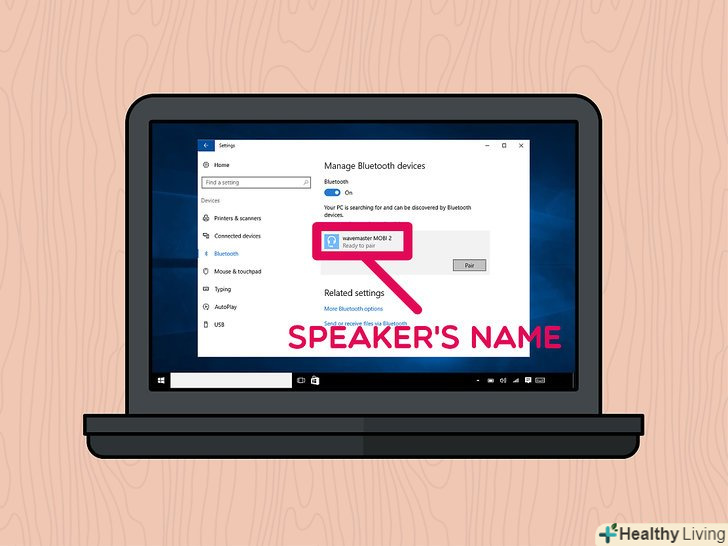 Клацніть поСполучення.ця опція знаходиться праворуч від імені колонок в розділі «Пристрої» вікна "Bluetooth". Через кілька секунд комп'ютер і колонки підключаться один до одного. Тепер музику та інші звуки з комп'ютера можна відтворювати через колонки.- Швидше за все, ім'ям колонок буде поєднання їх марки і моделі.