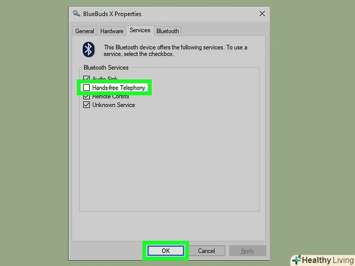 Встановіть гарнітуру для стерео аудіо.відкрийте пристрої Bluetooth, клацнувши правою кнопкою значок на панелі завдань. Клацніть правою кнопкою миші гарнітуру та виберіть Properties. Перейдіть на вкладку Services і дозвольте їй завантажити Services. Ми повинні переконатися, що опції "Audio Sink "і" Headset " - обидві обрані. Ви також можете зняти прапорець біля "Hands-free Telephony". Я виявив, що моя гарнітура перемикається в Моно звук при використанні Skype дзвінків. Вимкніть його, щоб цього не сталося. Натисніть кнопку Apply / OK і дозвольте комп'ютеру встановити додаткові драйвера (це можливо буде не необхідно, якщо Audio Sink і Headset обидві були включені).