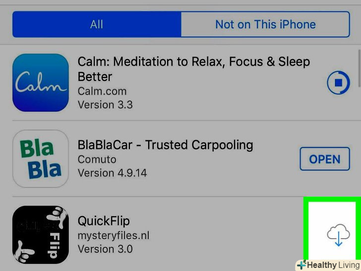 Торкніться < span class="nowrap" title="This is not a clickable button; it illustrates the button one should find." style="font-family: Segoe UI, Frutiger, Frutiger Linotype, Dejavu Sans, Helvetica Neue, Arial, sans-serif;letter-spacing:0px;padding:0em .6em; border:1px solid; border-color:#AAA #555 #555 #AAA; -moz-border-radius: 0px; -webkit-border-radius: 0px; border-radius: 0px; background-color: #F2F2F2; background-image: -moz-linear-gradient(top, #FCFCFC, #E0E0E0); background-image: -o-linear-gradient(top, #FCFCFC, #E0E0E0); background-image: - webkit-linear-gradient(top, # FCFCFC, #E0E0E0); background-image: linear-gradient(top, #FCFCFC, #E0E0E0);">все. ця опція знаходиться у верхній частині сторінки. Відобразиться список всіх додатків, які ви коли-небудь завантажували (незалежно від того, чи є вони на iPhone чи ні).- Натисніть "ні на цьому iPhone", щоб переглянути програми, яких немає на смартфоні.