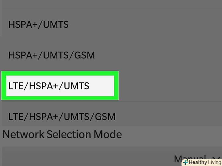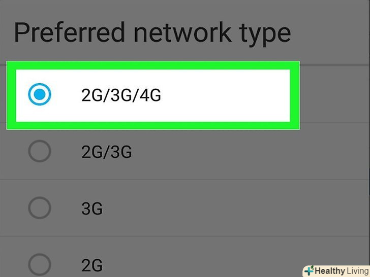 Натисніть4G and 3G (4G і 3G) або 4G, 3G and 2G (4G, 3G і 2G).ця опція знаходиться в меню на екрані "network mode".- Виберіть опцію 4G, яка включає швидкості 2G, якщо постійно їздите по країні. У цьому випадку стільниковий зв'язок буде працювати навіть у сільській місцевості.