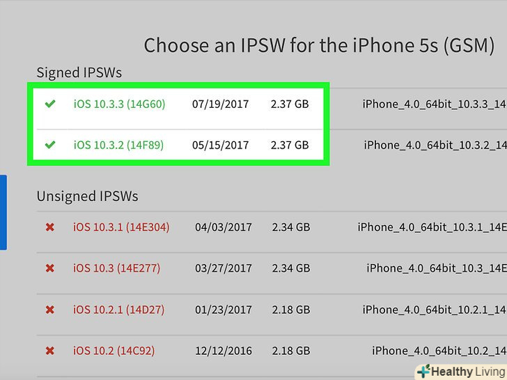 Перегляньте зелені посилання у верхній частині сторінки. ви побачите два посилання: на поточну версію iOS (наприклад, iOS 10.3) і на стару версію iOS (наприклад, iOS 10.2.1). Клацніть по версії iOS, на яку ви хочете перейти.- Червоні посилання-це IPSW-файли, які більше не авторизуються Apple. Ці файли не працюватимуть на вашому пристрої.