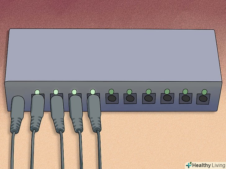 Підключіть педалі в ланцюзі до мережі. коли ви з'єднуєте педалі разом, ви можете купити силовий патч кабель, який дозволяє живити всі педалі за допомогою одного 9ти вольтового адаптера, а не тягатися з адаптерами для кожної з педалей. Це зазвичай найефективніший метод підключення ваших педалей до електрики, на відміну від батарейок і окремих адаптерів. Цей кабель являє собою велику кількість штекерів, підключених до одного кабелю, які ви можете підключати до ваших педалей.