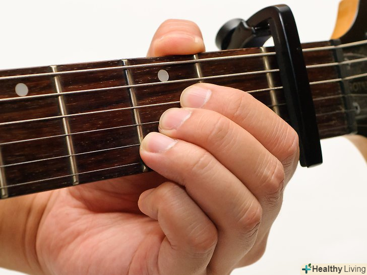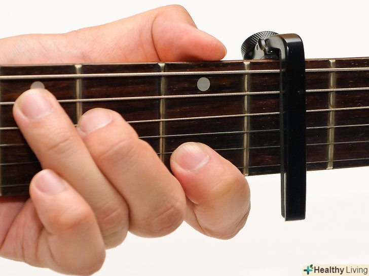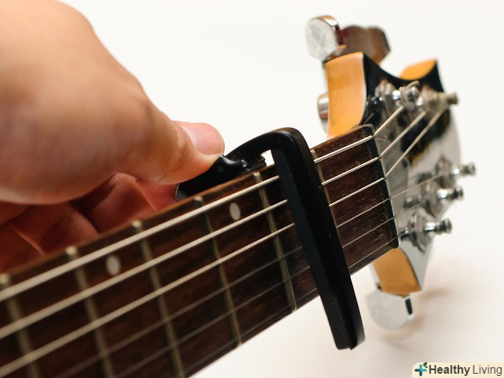 Виберіть каподастр.існує кілька різних видів каподастрів, але всі вони виконують одну і ту ж основну функцію-притискають струни в певній точці грифа, щоб підняти висоту звучання струн. Це досягається або за допомогою пружинного затиску (як прищіпка для білизни) або ручного затиску. Пружинні Каподастри більш поширені і як правило є міцними і надійними.- При виборі каподастра, переконайтеся, що на ньому немає гострих або виступаючих країв, які можуть пошкодити гриф вашої гітари.