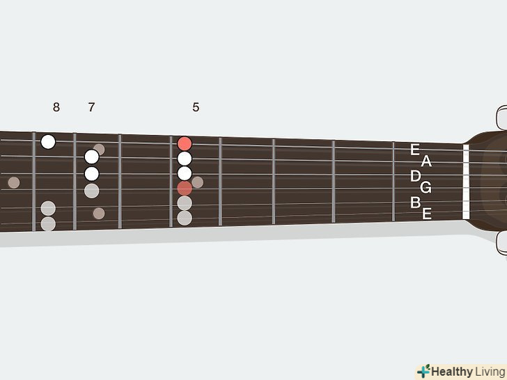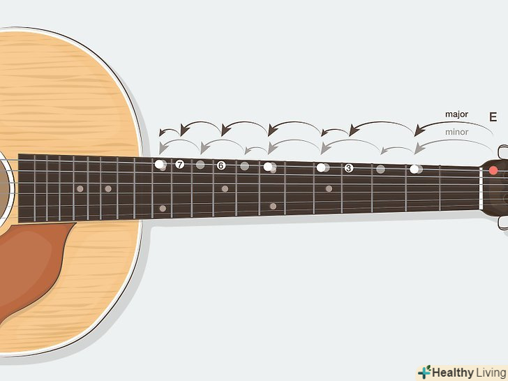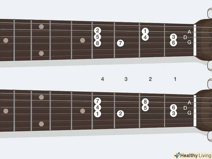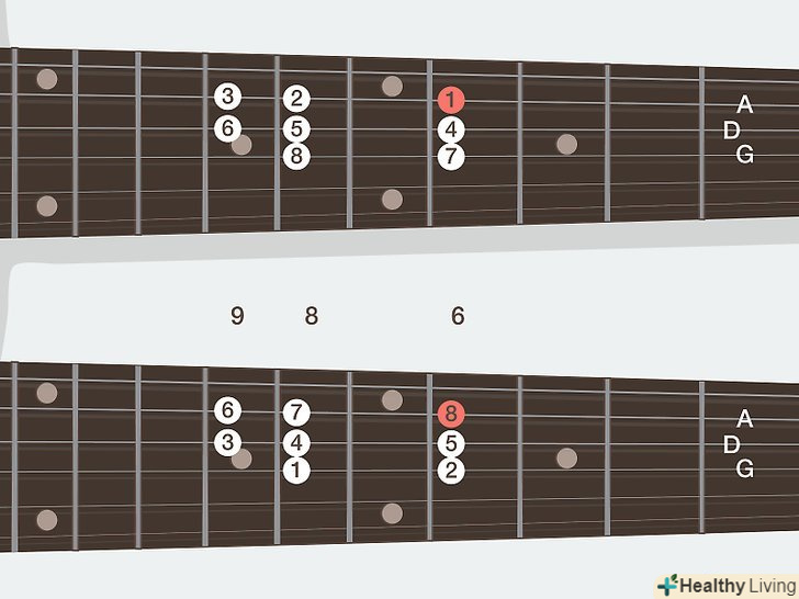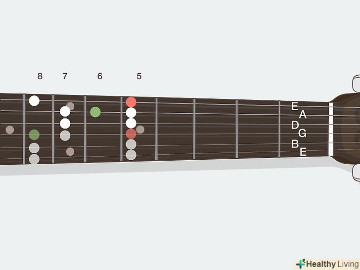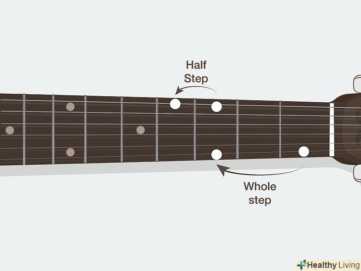 Вивчіть поняття тону і півтонів в гамах.простіше кажучи, гамма - це просто послідовність нот, які приємно звучать, коли граються по порядку. Коли ви перейдете до вивчення гам, ви зрозумієте, що всі гами будуються за схемами з «тонів» і «півтонів». Звучить досить складно, проте вони просто служать способом опису різних інтервалів на грифі[2]- Півтон — це інтервал в один лад нижче або вище. Наприклад, якщо ви граєте до (струна ля, третій лад), перехід на один лад вгору дасть вам ноту до-дієз (струна ля, четвертий лад). Можна сказати, що ноти до і до-дієз відрізняються на півтону.
