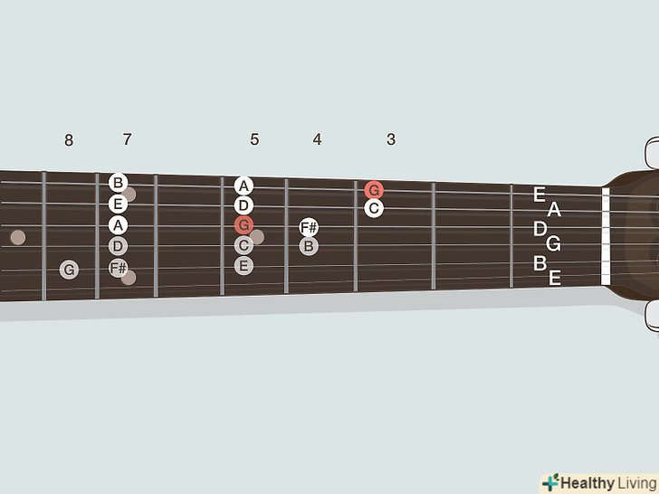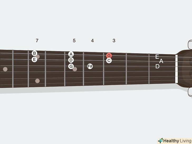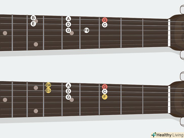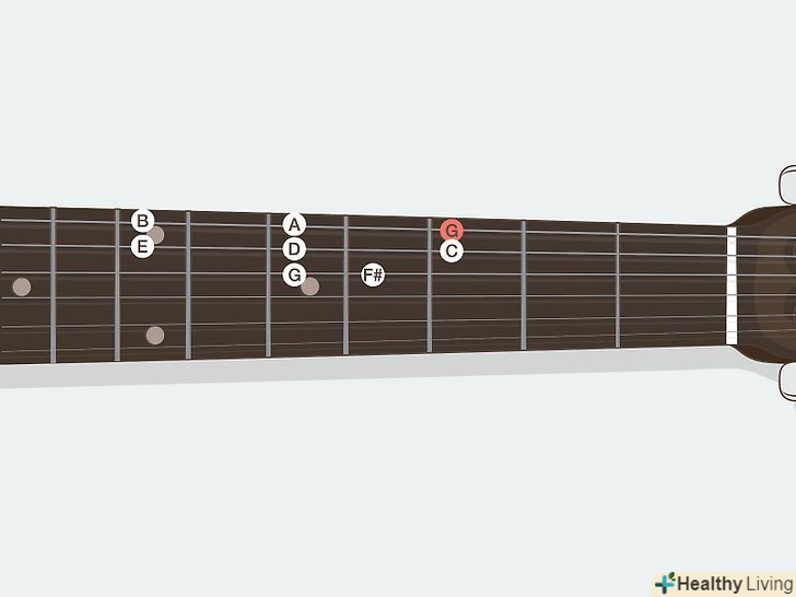 Вивчіть назви нот на грифі. кожен лад на гітарі бере ноту, у якій є своє ім'я. На щастя, всього існує тільки 12 нот — назви просто постійно повторюються. Ноти, які ви можете зіграти, представлені нижче. Майте на увазі, що у деяких нот є два відмінних назви:- Ля (A), ля-дієз/сі-бемоль (A#/Bb), Сі (B), до (C), до-дієз/ре-бемоль (C#/Db), ре (D), ре-дієз/мі-бемоль (D#/Eb), Мі (E), фа (F), фа-дієз/сіль-бемоль (F#/ Gb), сіль (G), сіль-дієз/ля-бемоль (g#/ab). Після цього ноти знову повторюються, починаючи з ля.