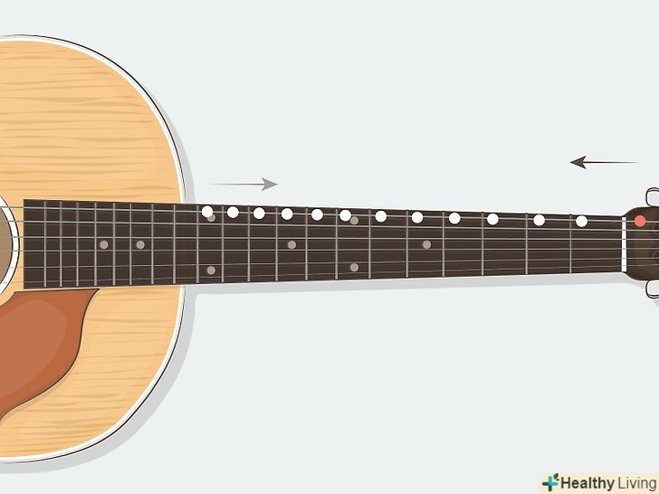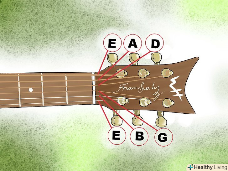 Вивчіть назви струн. ви можете посилатися на різні струни, називаючи їх як "найтовстіша, друга найтовстіша", і так далі, але набагато простіше розмовляти про гамах, знаючи їх дійсні назви. До того ж це ще й корисно, так як струни іменуються у відповідність ноті, яку вони беруть, коли не притискається ніякої долоні. У звичайній шестиструнній гітарі зі стандартним налаштуванням струни іменуються наступним чином:[1]- Мі (e, найтовстіша) - ля (A) — ре (D) — сіль (G) —Сі (B) —Мі (E, найтонша)