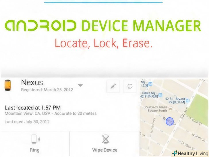 Пошук смартфона під управлінням Android.такий смартфон можна знайти двома способами. Якщо смартфон включений і знаходиться в зоні дії бездротового сигналу, ви можете відстежити місце розташування смартфона з комп'ютера через диспетчер пристроїв. Якщо смартфон вимкнений і знаходиться поза зоною дії бездротового сигналу, ви можете дізнатися останнє місце розташування смартфона (коли він був включений).[7]- Для роботи з диспетчером пристроїв увійдіть у ваш обліковий запис Google (це можна зробити з комп'ютера або мобільного пристрою). Диспетчер пристроїв Google негайно відобразить місце розташування смартфона на карті Google. Через диспетчер пристроїв ви також можете заблокувати телефон, зробити на нього дзвінок або видалити особисту інформацію.