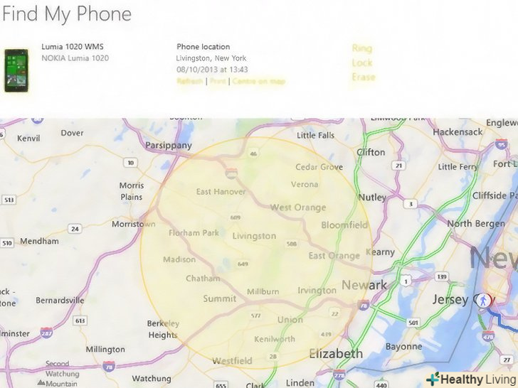 Пошук смартфона під керуванням Windows.користувачі таких смартфонів можуть скористатися спеціальною функцією, яка є у всіх пристроях під управлінням Windows 8.1 і пізніших версій цієї операційної системи. Відкрийте сторінку пристроїв Microsoft (зробіть це з комп'ютера або мобільного пристрою), щоб переглянути список всіх ваших смартфонів і планшетів під управлінням Windows. Далі скористайтеся сервісом з відстеження місця розташування пристрою.[10]- Скориставшись сервісом з відстеження місця розташування пристрою, ви можете заблокувати смартфон або видалити з нього особисту інформацію.