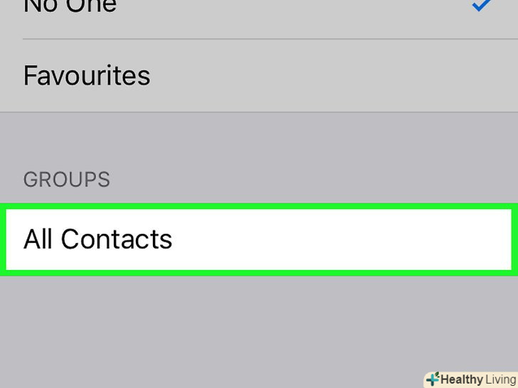 НатиснітьВід усіх. так ви оберете весь список контактів як виняток для функції»не турбувати". У цьому випадку ви не будете отримувати дзвінки від людей, телефонних номерів яких немає у вашому додатку "Контакти".- Цей метод блокує виклики з будь-яких номерів, яких немає в додатку "Контакти", тобто ви можете пропустити важливий дзвінок (наприклад, по роботі).