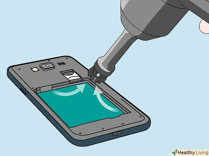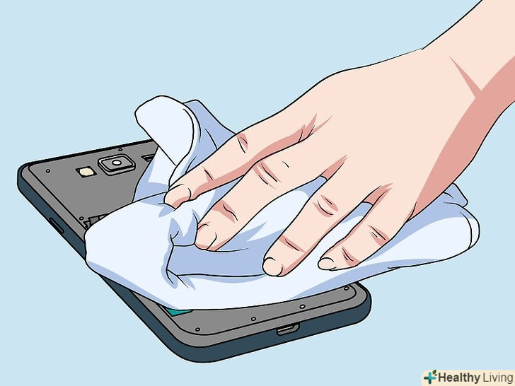 Протріть телефон і батарею насухо м'якою ганчіркою або рушником.після того як ви скористаєтеся пилососом або компресором, акуратно зітріть воду з поверхні телефону. Найголовніше-це просушити Внутрішні компоненти пристрою, але не варто забувати і про зовнішню поверхню телефону.[15]- Не трясіть і не перекладайте телефон з місця на місце, щоб вода не розтеклася всередині корпусу.