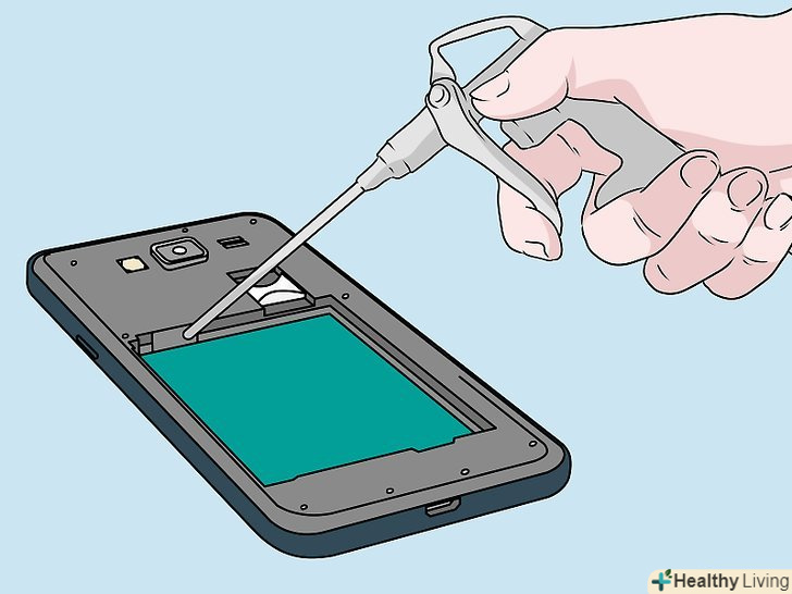 Скористайтеся повітряним компресором, щоб видалити воду з телефону.Переключіть Повітряний компресор в режим низького тиску, а потім продуйте поверхню і отвори телефону.[14]- Також можна застосувати балончик зі стисненим повітрям.