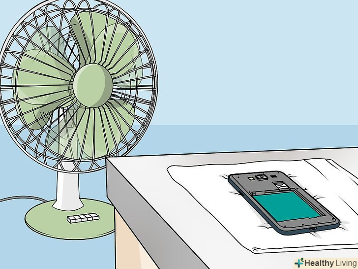 Покладіть телефон під вентилятор.Покладіть телефон на сухий рушник або іншу абсорбуючу поверхню. Тепер, якщо у вас є вентилятор, увімкніть його і направте на телефон, щоб вентилятор обдував пристрій.[16]