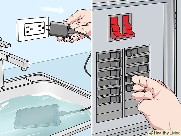 Вимкніть кабель живлення, якщо телефон підключений до електромережі і знаходиться у воді.якщо телефон підключений до електророзетки, спочатку вийміть з неї кабель живлення, а потім вийміть пристрій з води. Якщо не зробити цього, ви отримаєте удар електричним струмом.[2]- Буде краще, якщо ви відключите живлення в електрощиті.