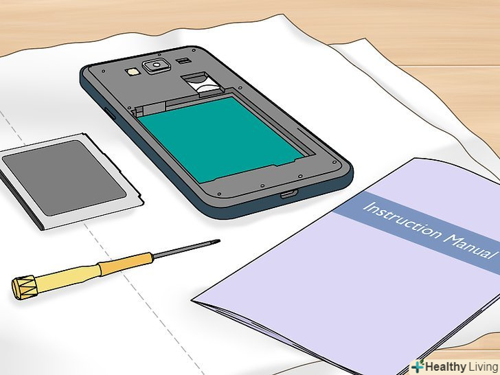 Зніміть кришку акумулятора і витягніть батарею, а потім покладіть їх на паперові рушники.вийнявши телефон з води, швидко візьміть кілька паперових рушників або м'яку суху тканину. Покладіть на них телефон, а потім зніміть кришку і вийміть батарею. У більшості випадків для цього знадобиться хрестоподібна викрутка. Якщо у вас iPhone, знайдіть спеціальну викрутку Pentalobe.[4]- Почитайте інструкцію до телефону, якщо не знаєте, як витягти акумулятор.
