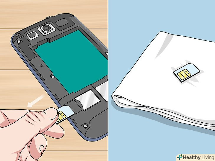 Вийміть SIM-карту, якщо вона є в телефоні.тепер протріть її сухим паперовим рушником або тканиною. Покладіть карту на суху тканину або паперовий рушник, щоб вона висохла. Якщо у вашому телефоні SIM-карти немає, пропустіть цей крок.[7]- На SIM-картці можуть зберігатися цінні дані, наприклад, контакти. Тому в деяких випадках краще подбати про SIM-карту, ніж про телефон.