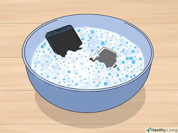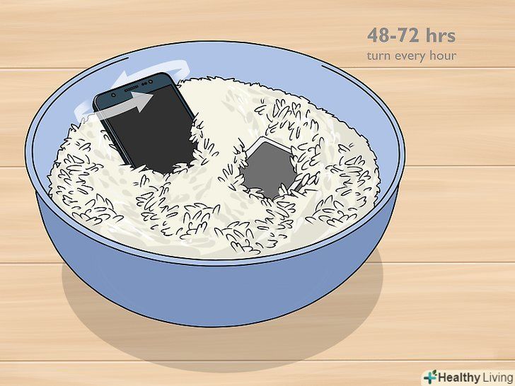 Покладіть телефон в миску з рисом на 48-72 години.насипте 1 кг рису швидкого приготування у велику миску. Тепер занурте телефон і витягнуту батарею в рис. Рис поглине вологу, яка знаходиться всередині пристрою.[9]- Повертайте телефон щогодини, поки не підете спати. Робіть це, щоб вода витекла з телефону.[10]