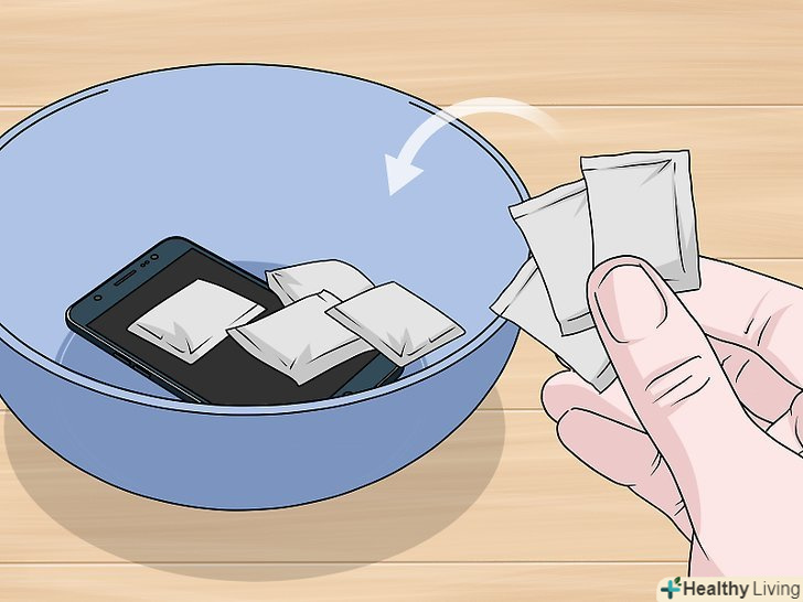 Використовуйте пакети з силікагелем замість рису (якщо вони у вас є). покладіть пакет (и) з силікагелем, телефон і витягнуту батарею в контейнер. Тепер не чіпайте телефон протягом 48-72 годин, щоб гель поглинув вологу, що залишилася в телефоні.[11]- Пакети з силікагелем-це маленькі пакетики, які можна знайти в коробках з новим взуттям, нових гаманцях і в інших продуктах.