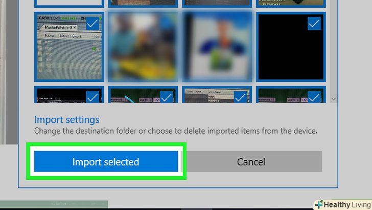 НатиснітьІмпортувати вибрані.ця кнопка знаходиться у верхній правій частині вікна. Почнеться процес копіювання фотографій на комп'ютер.- Пропустіть цей крок, якщо ви натиснули "імпортувати всі нові фото".