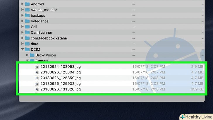 Виберіть потрібні фотографії.утримуйте ліву кнопку миші і проведіть вказівником по фотографіях, які ви хочете скопіювати на комп'ютер. Також можна затиснути ⌘ command і клацнути по кожній потрібній фотографії.- Щоб вибрати всі фотографії в папці, натисніть⌘ Command+A.
