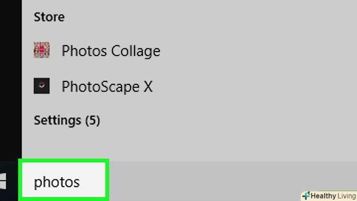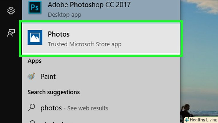 Клацніть поФотографії.ця програма знаходиться у верхній частині меню "Пуск". Це значок у вигляді двох гірських вершин на кольоровому тлі. Відкриється додаток "Фотографії".