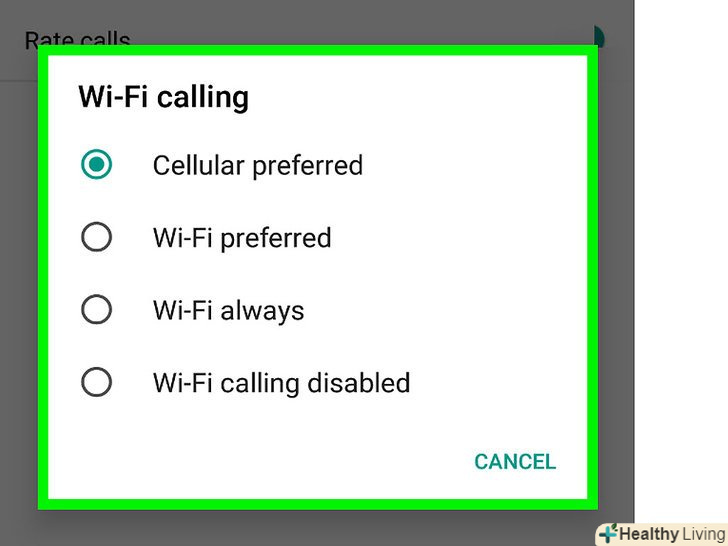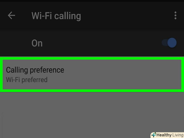 Виберіть потрібну опцію.можна дзвонити по бездротовій мережі, мобільній мережі і ніколи не використовувати мобільну мережу. Натисніть на потрібну опцію.- Бездротова мережа - дзвінки будуть відбуватися по бездротовій мережі, якщо вона доступна. Тобто якщо смартфон підключений до бездротової мережі, мобільною мережею Ви користуватися не будете.