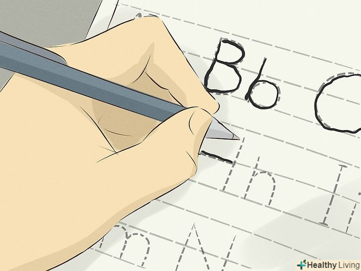 Для початку пропишіть алфавіт протилежною рукою або обводите букви по точках.це простий спосіб ознайомити протилежну руку з базовими рухами при листі. Прагніть до того, щоб лінії були прямими, а вигини плавними, але не переживайте, якщо перший час будете робити багато помилок. Тренуйтеся не менше 10 хвилин в день, поки не звикнете здійснювати чіткі рухи.[7]- Можливо, перший час ви будете відчувати напругу в руці. В такому випадку просто зробіть перерву і повторіть спробу пізніше. Напруга в кінці кінців пройде.