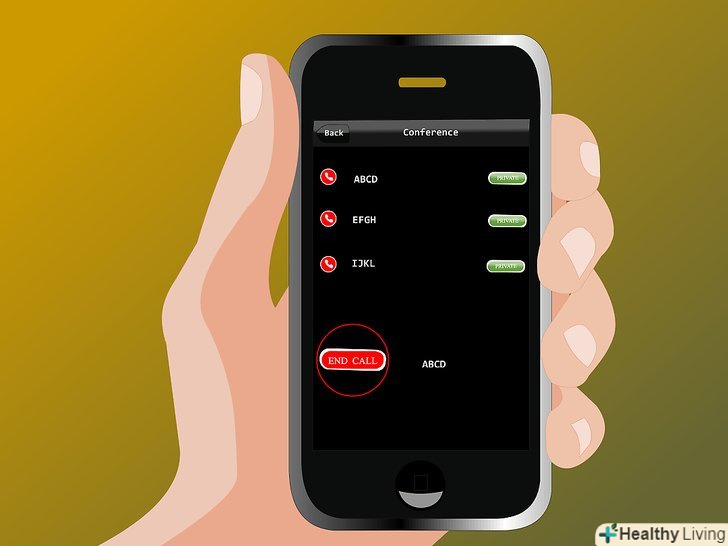 Щоб прибрати когось з розмови: натисніть «конференція», натисніть на значок червоного телефону поруч з тією людиною, яку хочете прибрати з розмови і натисніть «завершити дзвінок».