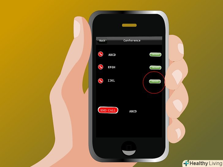Щоб індивідуально поговорити з кимось конкретним: натисніть "конференція«, потім натисніть» Приватний" поруч з людиною. Натисніть "Об'єднати розмову", щоб продовжити конференцію.