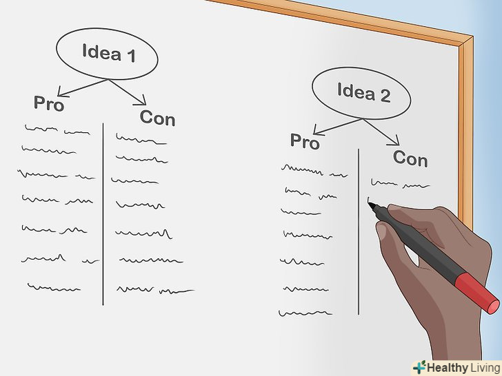 Складіть списки " за " і "проти", щоб опрацювати свої ідеї.частина творчості-це оцінка власної роботи і вибір кращих ідей. Дослідіть свої ідеї, розбиваючи їх на дві колонки-плюси і мінуси. Завдяки наявності переваг і недоліків концепції ви зможете побачити її з різних точок зору і розвинути її відповідним чином.[4] Складіть списки " за " і "проти", щоб опрацювати свої ідеї.частина творчості-це оцінка власної роботи і вибір кращих ідей. Дослідіть свої ідеї, розбиваючи їх на дві колонки-плюси і мінуси. Завдяки наявності переваг і недоліків концепції ви зможете побачити її з різних точок зору і розвинути її відповідним чином.[4]- Наприклад, якщо ви думаєте про додавання велюр до дизайну кімнати, можна зважити практичні плюси та мінуси, такі як м'яка текстура та вимоги до чищення.