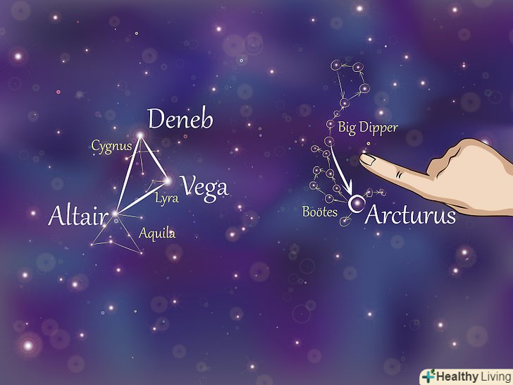 Праворуч від нас (на Заході) і трохи північніше ви знайдете великий ківш (також відомий як Плуг), що є насправді іншим астеризмом (ми розглянемо його докладніше в подальшому).Слідуйте дузі ручки на південь у напрямку дуже яскравої зірки;" дузі на Арктур", блискучій помаранчевій зірці, що відзначає сузір'я Волопаса. Праворуч від нас (на Заході) і трохи північніше ви знайдете великий ківш (також відомий як Плуг), що є насправді іншим астеризмом (ми розглянемо його докладніше в подальшому).Слідуйте дузі ручки на південь у напрямку дуже яскравої зірки;" дузі на Арктур", блискучій помаранчевій зірці, що відзначає сузір'я Волопаса.