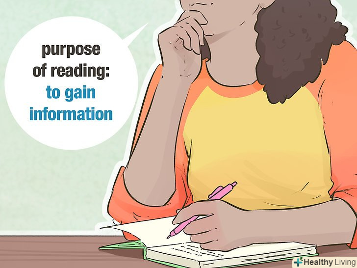 Визначте мету читання.мета читання впливає на характер роботи з текстом. Наприклад, читати роман для уроку і для задоволення-абсолютно різні заняття, оскільки в першому випадку потрібно буде зрозуміти і запам'ятати текст, а не насолоджуватися процесом. Задумайтеся: навіщо я читаю цей текст?- Якщо вам потрібно отримати інформацію (наприклад, щоб відповідати робочим або навчальним вимогам), то краще використовувати екстенсивні методи.
