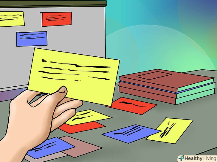 - Можна зробити картки-підказки. Візьміть упаковку невеликих карток і запишіть на них ключові слова (ніколи не пишіть повні пропозиції) або ідеї, дати, схеми, формули або Імена, після чого почніть розповідати вголос. Якщо ви складали їх згідно з планом, то краще спочатку перемішати їх. Це повернення до ідеї про те, що змішування інформації змушує мозок працювати інтенсивніше і більш надійно зберігати інформацію.