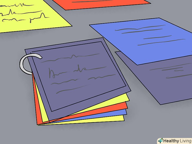 Трансформуйте конспекти лекцій в карти-підказки.дослідження підтверджують, що студенти, які використовують карти-підказки при підготовці до іспитів, отримують більш високі оцінки, ніж ті, хто їх не використовує. Виходить, що це простий спосіб поліпшити свою оцінку.[12] вам знадобиться упаковка невеликих карток, олівець, ручка або маркер, який не проявиться на іншій стороні паперу. Спочатку напишіть коротке запитання з одного боку картки, а потім на інший вкажіть відповідь. Виберіть першу картку, прочитайте питання і дайте на нього відповідь. Переверніть карту і перевірте правильність своєї відповіді.- Зберіть всі картки-підказки в одну стопку, не розділяючи їх на кілька стопок. Це створить просторовий ефект, що поліпшує запам'ятовування.